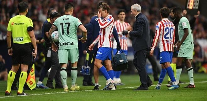 这名球员的运气糟糕到了极点。比赛下半场中段,他在拼抢中腿部被迫过度拉伸,随即倒地。他立刻主动将球踢出赛场,清楚自己再度受伤。事发地点就在马竞替补席旁,西蒙尼也第一时间关注着场上情况。